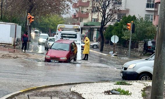 Milas’ Menteşe kavşağında Karayolları tarafından yapımı devam eden alt yapı çalışmasındaki çukura düşen araç çekici yardımı ile kurtarıldı.